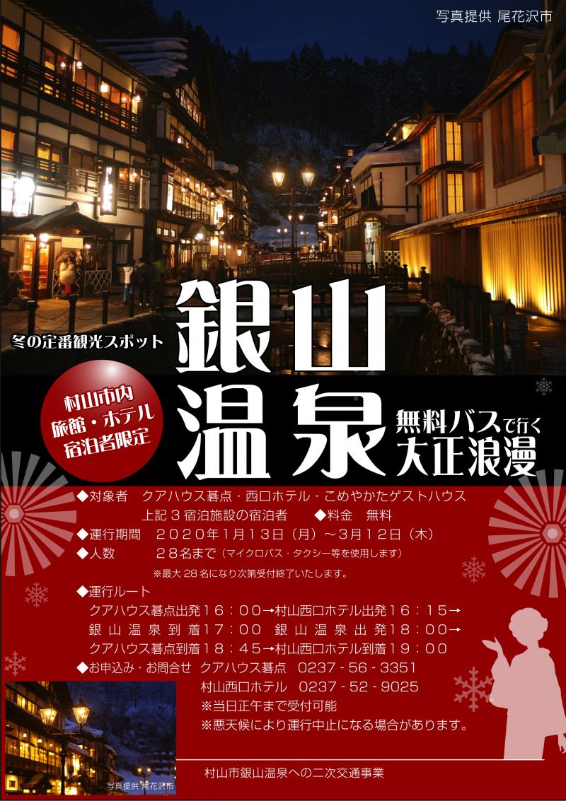 価格はそのままで、当館既存の全宿泊プランに並列で、無料バスで行く銀山温泉が付いてくるとてもお得なプランを販売しております!