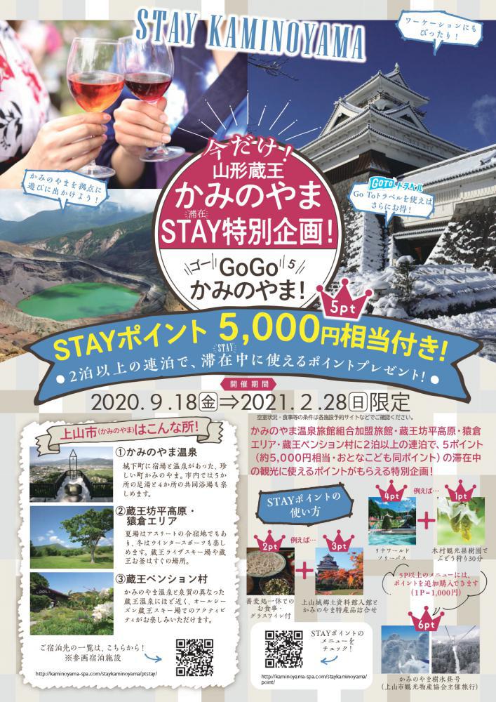 かみのやま温泉旅館組合加盟旅館、蔵王坊平高原、猿倉エリア、蔵王ペンション村に2泊以上の連泊で、5ポイント(約5,000円相当・おとなこども同ポイント)の滞在中の観光に使える【ステイポイント】がもらえる特別企画です! ★ 〜 ★ 〜 ★ 〜 ★ 〜 ★ 〜 ★ 〜 ★ 〜 ★ 開催期間:2020年9月18日(金)〜2021年2月28日(日)限定 (2泊の場合、最終宿泊開始設定日は2月26日(金)となります) 参画宿泊施設:ホームページをご覧ください ★ご利用方法参画宿泊施設の各ウェブサイトまたはお電話にて、2泊以上のご宿泊をお申込ください。宿泊施設のフロントにて、チェックイン時に【ステイポイント】5ポイントをお受け取りください。 ★ステイポイントとはかみのやまならではの味覚や体験、ツアー等に利用できます。予約が必要なメニューがあります。お申込は期日までWEBまたは上山市観光物産協会までどうぞ。メニュー一覧はこちら <使い方>例えば・・・・観光果樹園でぶどう狩り30分(1ポイント) + リナワールドフリーパス(4ポイント)=5ポイント・蕎麦処でのお食事(2ポイント) + 上山城入館とかみのやま特産品詰め合わせ(3ポイント)=5ポイント・かみのやま樹氷昼号(6ポイント)*5ポイント以上のメニューは、ポイントを追加購入できます(1ポイント1,000円) お問合せ:(一社)上山市観光物産協会 TEL.023-672-0839
