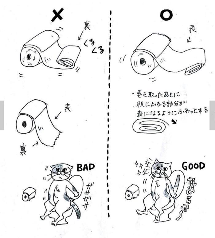 (ネットより)月曜日のあさイチでトイレットペーパーの使い方をやっていました。何気なく使っているトイレットペーパーの使う量から入って(結論は、決まっていない)量が多かろうが菌に対してはあまり効果が無い。10枚重ねだろうが菌は簡単にすり抜けてしまう。要は終わった後よく手を洗う。これしかないそうです。気になったのはトイレットペーパーの巻き方。トイレットペーパーには裏表があるそうです。知らないで、×のゴワゴワの方で長年使ってた。(私はシングル派 量の調整が私好みにできて簡単)ちなみに2枚重ねはどちらも表側を使っているので、どんな巻き方でも表です。