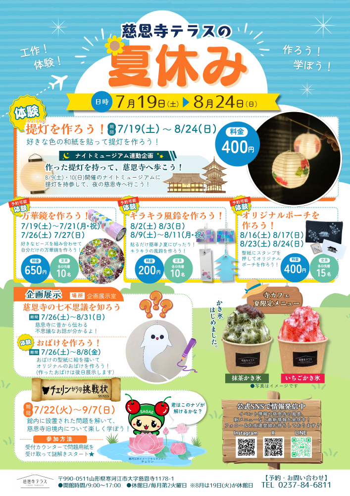 慈恩寺テラス夏のイベント「慈恩寺テラスの夏休み」を開催中!期間:7月19日(土)〜8月24日(日)期間中いつでも参加できる「提灯を作ろう!」では、慈恩寺の屋根に使用されていた「茅」と月山和紙を使用した提灯づくりを体験できます。また、毎週末ものづくりイベントを開催!!7/19〜21・7/26〜27「万華鏡を作ろう!」8/2〜3・8/9〜11「キラキラ風鈴を作ろう!」8/16〜17・8/23〜24 「オリジナルポーチを作ろう!」※全て講師無しの体験となります。 期間中は「チェリンからの挑戦状」に無料で参加できます☆館内に設置された問題を解いて慈恩寺旧境内について楽しく学べます。 企画展示「慈恩寺の七不思議を知ろう」では、慈恩寺に昔から伝わる不思議なお話について知ることができます。詳しい内容は、画像や公式Instagramをご覧ください。 夏休みも慈恩寺テラスへのご来館お待ちしております♪