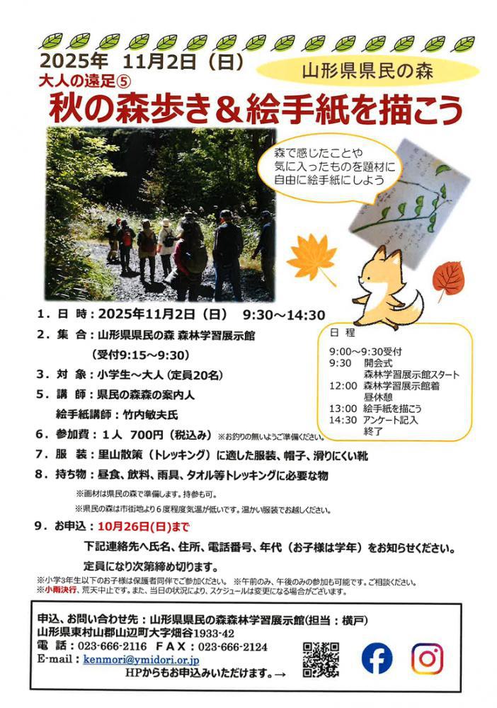 秋の県民の森で心豊かな一日を過ごしませんか?色鮮やかな紅葉に包まれながら森を歩き、そこで見つけた自然の美しさや感じたことを自由に「絵手紙」にする「秋の森歩き&絵手紙を描こう」が開催されます。森の案内人が同行する森歩きを楽しみ、絵手紙を描いて、忘れられない秋の思い出を作りましょう。 イベント概要 開催日時2025年11月2日(日) 9:30〜14:30(受付時間 9:15〜9:30) 集合場所山形県県民の森 森林学習展示館 対象・定員小学生〜大人(定員20名)※小学生3年生以下のお子様は保護者同伴でご参加ください。 参加費1人 700円(税込み)※お釣りの無いようご準備ください。 講師森の案内人:県民の森森の案内人絵手紙講師:竹内 敏夫 氏 当日の楽しみ方 午前の部:秋の森を歩こう専門の「森の案内人」のガイドのもと、紅葉で色づく森の中を散策します。木々や森の生き物たちの話を聞きながら歩けば、普段とは違う発見があるはず。澄んだ空気と美しい景色に、心も体もリフレッシュできます。 午後の部:絵手紙を描こう森歩きで感じたことや、見つけた落ち葉や木の実など気に入ったものを題材に、自由に絵手紙を描きます。講師の竹内敏夫先生が丁寧に教えてくれます。旅の思い出を、温かみのある絵手紙にしてみましょう。※画材は県民の森で準備しますが、ご自身のものを持参しても構いません。 当日のスケジュール 9:00〜9:30受付 9:30開会式・森林学習展示館スタート 12:00森林学習展示館着・昼休憩 13:00絵手紙を描こう 14:30アンケート記入・終了 服装と持ち物 服装 トレッキングに適した動きやすい服装 帽子 滑りにくい靴(トレッキングシューズ等)※県民の森は市街地より6度程度気温が低いため、暖かい服装でお越しください。 持ち物 昼食 飲料 雨具 タオル などトレッキングに必要なもの お申込み・お問い合わせ申込締切:2025年10月26日(日)まで定員になり次第締め切りますので、お早めにお申し込みください。下記の連絡先へ氏名、住所、電話番号、年代(お子様は学年)をお知らせください。山形県県民の森 森林学習展示館(担当:横戸) 電話: 023-666-2116 Email: kenmori@ymidori.or.jp 公式ホームページからもお申込みいただけます※小雨決行、荒天中止です。※当日の状況によりスケジュールは変更になる場合がございます。 よくある質問 (FAQ)Q. 雨が降ったらどうなりますか?A. 小雨の場合は決行しますが、荒天の場合は中止となります。中止の場合は事前にご連絡いたします。Q. 絵手紙の道具は必要ですか?A. 絵手紙に必要な画材は、県民の森で準備いたします。もちろん、ご自身の使い慣れた道具を持参いただいても構いません。Q. 午前または午後のみの参加は可能ですか?A. 可能です。ご希望の場合は、お申込みの際にご相談ください。 アクセスマップ山形県県民の森 森林学習展示館〒990-0361 山形県東村山郡山辺町大字畑谷1933-42 Googleマップでルートを見る {"@context":"https://schema.org","@graph":[{"@type":"Event","name":"秋の森歩き&絵手紙を描こう","startDate":"2025-11-02T09:30+09:00","endDate":"2025-11-02T14:30+09:00","eventAttendanceMode":"https://schema.org/OfflineEventAttendanceMode","eventStatus":"https://schema.org/EventScheduled","location":{"@type":"Place","name":"山形県県民の森 森林学習展示館","address":{"@type":"PostalAddress","streetAddress":"大字畑谷1933-42","addressLocality":"山辺町","addressRegion":"山形県","postalCode":"990-0361","addressCountry":"JP"}},"image":["https://yamagata-kouiki.info/wp-content/uploads/2023/10/autumn-forest-walk.jpg"],"description":"2025年11月2日に山形県県民の森で開催される、秋の自然を満喫するイベント。専門ガイドと共に紅葉の森を散策し、午後は森で感じたことや見つけたものを題材に絵手紙を描きます。初心者の方も大歓迎です。","offers":{"@type":"Offer","url":"http://www.ymidori.or.jp/kenmori/","price":"700","priceCurrency":"JPY","availability":"https://schema.org/InStock","validFrom":"2025-10-01T00:00+09:00","validThrough":"2025-10-26T23:59+09:00"},"performer":[{"@type":"Person","name":"県民の森の案内人"},{"@type":"Person","name":"竹内 敏夫"}],"organizer":{"@type":"Organization","name":"山形県県民の森","url":"http://www.ymidori.or.jp/kenmori/"}},{"@type":"Article","mainEntityOfPage":{"@type":"WebPage","@id":"https://yamagata-kouiki.info/archives/event/autumn-walk-etegami-2025"},"headline":"【2025年秋】山形県県民の森で秋の森歩き&絵手紙を描こう!","datePublished":"2025-10-15T00:00:00+09:00","dateModified":"2025-10-15T00:00:00+09:00","author":{"@type":"Organization","name":"山形県のほっぺtourism"},"publisher":{"@type":"Organization","name":"山形県のほっぺtourism","logo":{"@type":"ImageObject","url":"https://yamagata-kouiki.info/wp-content/themes/sango-child-theme-02/logo.png"}}},{"@type":"FAQPage","mainEntity":[{"@type":"Question","name":"雨が降ったらどうなりますか?","acceptedAnswer":{"@type":"Answer","text":"小雨の場合は決行しますが、荒天の場合は中止となります。中止の場合は事前にご連絡いたします。"}},{"@type":"Question","name":"絵手紙の道具は必要ですか?","acceptedAnswer":{"@type":"Answer","text":"絵手紙に必要な画材は、県民の森で準備いたします。もちろん、ご自身の使い慣れた道具を持参いただいても構いません。"}},{"@t