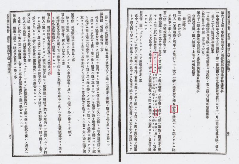 洋風建築が立ち並び、陸蒸気が汽笛を鳴らして出発する。日本における文明開化は順調のように思えるが、当時の鉄道用語からみると、欧米と日本とのギャップを如何に調整するか、と苦心した姿が見えてくる。  その一つが「ステーション」である。『駅のはなし』には、新橋ステーションという名が使われている。また前回までに紹介した浮世絵のキャプションにも「新橋ステーション」の文字が見られる。これは鉄道開業の4か月前(明治5年5月4日)に布告された太政官第146号(鉄道略則)の規定に基づくもののようである。同略則ではチケットあるいは乗車券を「手形」、駅を「立場(たてば)」と表記している。また鉄道略則には、現在にも通じるような規定があるので紹介します。///第7条 喫煙並びに女性専用部屋への男性立ち入り禁止「ステーション」構内の禁煙箇所ならびに禁煙車内においては、喫煙を禁止する。また女性のためにある車両および部屋等に男性がみだりに立ち入ってはならない。もしこれらの禁止事項を犯し、係の者の注意を聞かない者は、車外ならびに鉄道構外にすぐに退去させる。///  明治33年には鉄道営業法が制定され、鉄道略則は廃止された。鉄道営業法では、ステーションは「停車場」に、手形は「乗車券」と表記されている。ちなみに現在一般的に使用している「駅」という用語を確認できたのは、「鉄道に関する技術上の基準を定める省令(平成13年12月25日国土交通省令第151号)」の次の条文である。///鉄道営業法(明治33年法律第65号)第1条の規定に基づき、鉄道に関する技術上の基準を定める省令を次のように定める。(定義)第2条 この省令において、次の各号に掲げる用語の意義は、それぞれ当該各号に定めるところによる。1〜6   (略) 7 駅    旅客の乗降又は貨物の積卸しを行うために使用される場所をいう。8 信号場  専ら列車の行き違い又は待ち合わせを行うために使用される場所をいう。9 操車場  専ら車両の入換え又は列車の組成を行うために使用される場所をいう。10 停車場  駅、信号場及び操車場をいう。11 車庫   専ら車両の収容を行うために使用される場所をいう。///  史料の見落としがなければ、「駅」が法律上登場するのは平成13年ということになる。江戸時代に宿場間に置かれた馬や役夫の中継地を指す「駅」と混同しないように配慮された、という解説もみられたが、新しい社会システムを民衆に周知させることは、建物等の建設以上に難しい問題であったのかもしれない。