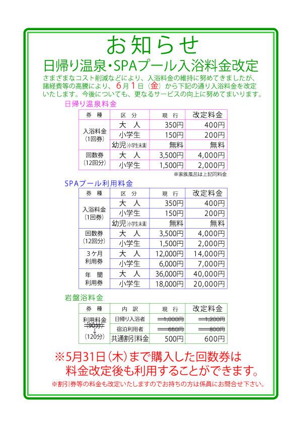 ●日帰り温泉・SPAプール入浴料金改定のお知らせ