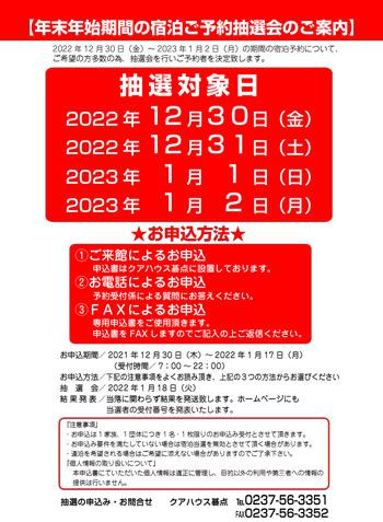 2022年12月30日(金)〜2023年1月2日(月)の期間の宿泊予約について、 ご希望の方多数の為、抽選会を行いご予約者を決定致します。