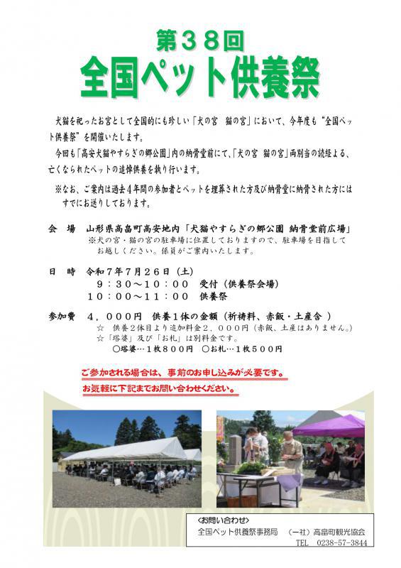 ↑申込書はこちら↑犬猫を祀ったお宮として全国的にも珍しい「犬の宮・猫の宮」において、今年度も「全国ペット供養祭」を開催いたします。今回も、「高安犬猫安らぎの郷公園」内の納骨堂前にて「犬の宮・猫の宮」両別当の読経による亡くなられたペットの追悼供養を執り行います。 是非ご参加くださいますようご案内申し上げます。・会 場 山形県高畠町高安地内「犬猫やすらぎの郷公園 納骨堂前広場」 ※犬の宮・猫の宮の駐車場に位置しておりますので、 駐車場を目指してお越しください・日 時 令和7年7月26日(土) 9:30〜10:00 受付(供養祭会場) 10:00〜11:00 供養祭・参加費 4,000円 供養1体の金額(祈祷料、赤飯・土産含 ) ☆ 供養2体目より追加料金2,000円(赤飯、土産はありません。) ☆「塔婆」及び「お札」は別料金です。 ○塔婆…1枚800円 ○お札…1枚500円・申込方法 添付の全国ペット供養祭申込書に必要事項を記載の上、 7月18日《金》までお申し込み・ご送金下さい。◆「犬の宮」「猫の宮」と「全国ペット供養祭」高畠町高安地区にある、「犬の宮」「猫の宮」は全国的にも珍しい犬猫を祀った社で伝説的な物語としても長い間語り伝えられてきました。更に故戸川幸夫氏の直木賞受賞作品「高安犬物語」の舞台としても紹介されています。 『犬の宮』は、安産と無病息災の神、『猫の宮』は、養蚕と商売繁盛の神として古くから信仰されてきましたが、特に近年では世界的なペットブームに乗って、ペットの供養や健康祈願に訪れる参拝者で賑わっています。町を挙げて全国ペット供養祭を開催することで、ペットの供養・健康祈願はもちろん、祭りを通しての地域活性化を目的とし、今年で38回目を迎えます。【お問い合わせ】一般社団法人 高畠町観光協会TEL:0238-57-3844 FAX:0238-57-4178mail:mahoroba@takahata.info