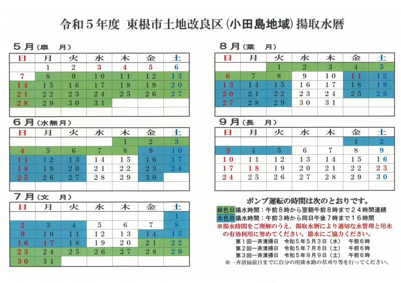 本日、令和5年度小田島地域揚取水暦をアップしました。