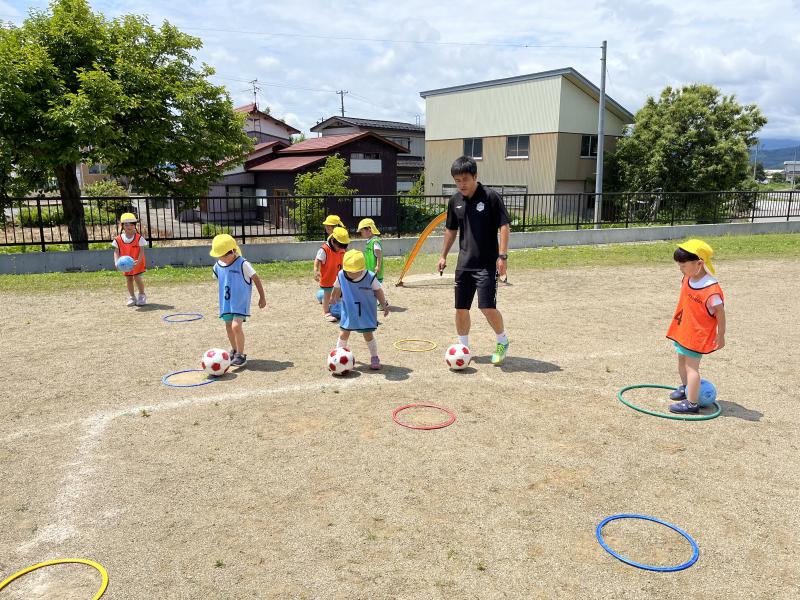 コーチのしおちゃんと一緒にサッカーボールを使ってたくさん遊びました。