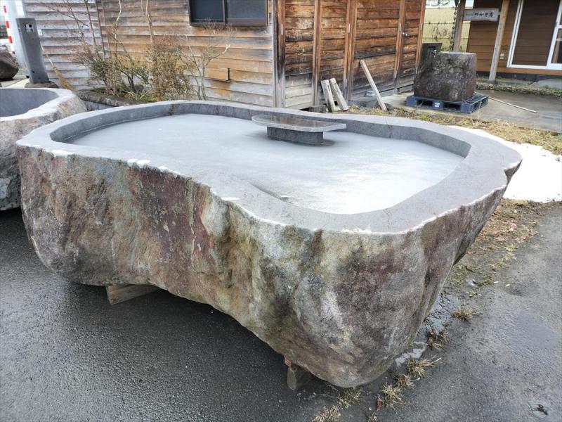 台座があるちょっと変わった石風呂です。お酒やおつまみを置いてお湯に浸かるのはどうでしょうか。露天だとしたらもう最高ですね。置物やタオルの置き場としてもちょうどよさそうです。  原料:蔵王石(安山岩)入浴可能人数(目安):4、5人展示場にて展示中  一つとして同じ表情の無い蔵王の天然石から削り出す石風呂。永い年月の中で石に蓄えられたパワーは心と身体に癒しを与えてくれます。____それはまさに自然からの贈り物。株式会社ざおうコーポレーション 石材部門では蔵王の天然石を使った石風呂を制作・販売しています。ご興味がございましたらぜひ一度展示場へお越しください。https://zao-stone.jp