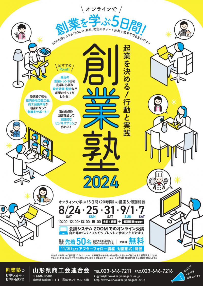 創業に必要な「資金計画」「税金」など、創業のすべてが分かる! 起業を決める!行動と実践 「創業塾2024」 -----------------------------------------------------------------------------------【開催日時】8月24日(土)・25日(日)・31日(土)・9月1日(日)・9月7日(土)の5日間 (毎回10:00〜12:00、13:00〜15:00の4時間+個別相談)・全講座オンライン(ZOOM)開催で自宅等からでも参加OK!・充実のサポート体制で初めての方でも安心です!・受講料:無料・定 員:先着50名 創業塾2024.pdf (0.64MB)講座内容等の詳細は添付のチラシをご覧ください!【お申込み先】お近くの商工会又は山形県商工会連合会へ(TEL:050-3540-7211) 創業塾2024申込専用WEBフォームからもお申込みいただけます。--------------------------------------------------------------------------------- ※山形県外在住の方のお申込みについて 山形県内にて創業した方(店舗等が山形県内に所在)または創業予定の方に 限定させていただきますので、予めご了承ください。---------------------------------------------------------------------------------